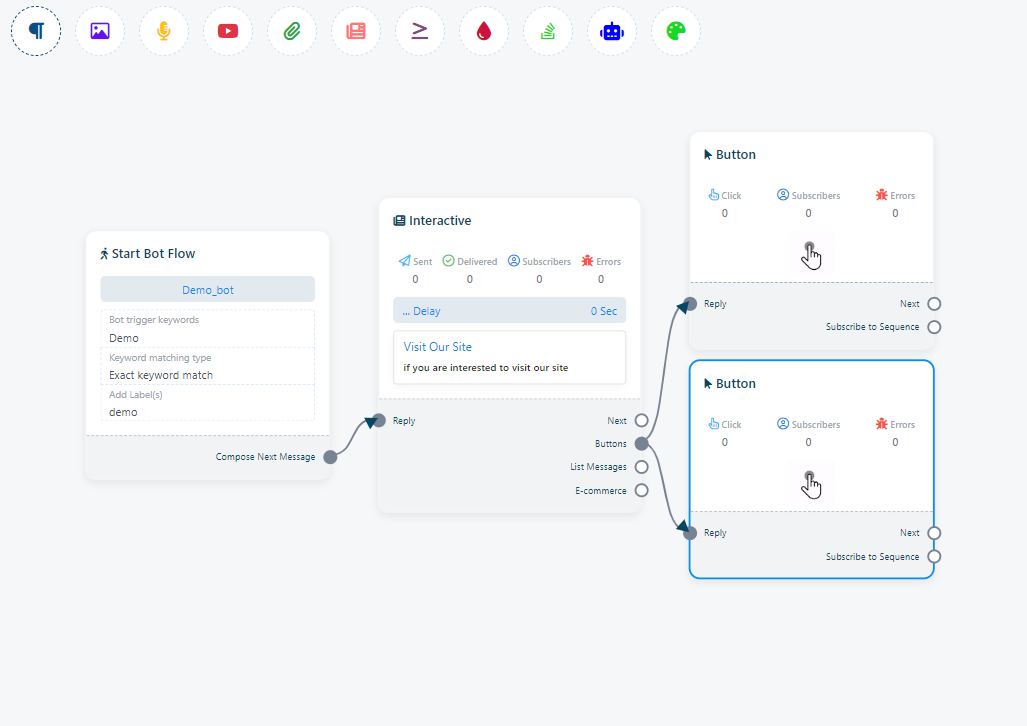 - Add interactive component and fill the fields .In interactive you will find “Button” socket. You can add button form there. (You can’t use more than 3button in an Interactive)
