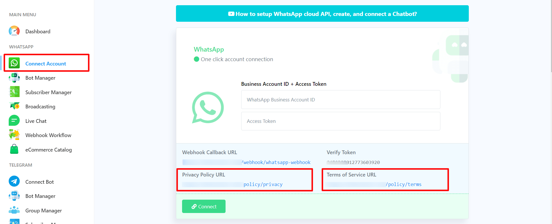 To get the callback URL and verify the token from Bot ilimify. Login to your account and go to the dashboard of Bot ilimify. At the left sidebar of the Dashboard, under the WhatsApp section, you will see connect WhatsApp option. Now click on the connect WhatsApp menu and instantly, Connect WhatsApp Business page will appear.